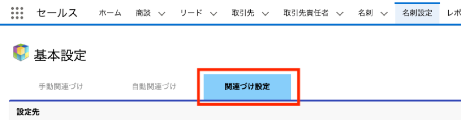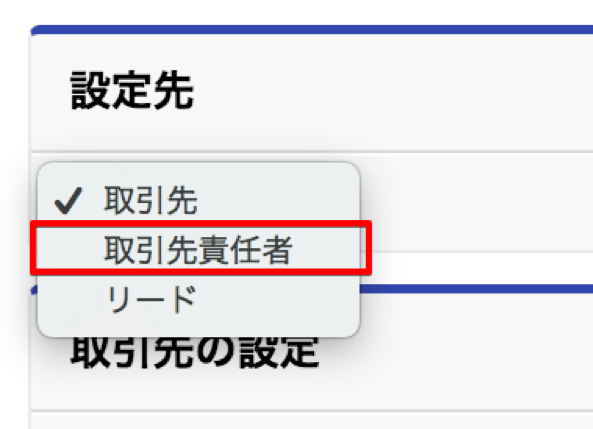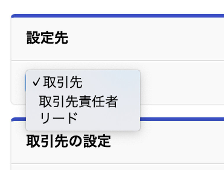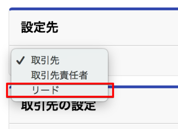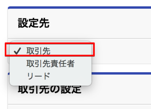 ページ先頭のプルダウンから、設定先のオブジェクトとして「取引先」・「取引先責任者」・「リード」を選択できます。