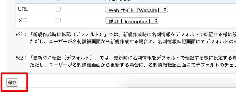 | 名刺項目 | 転記先項目選択 | 住所連結設定 | 新規作成時に転記 | 更新時に転記 | 名刺情報が空白時 |