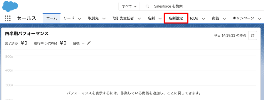 1. システム管理者権限をもつSalesforceアカウントでログイン後、[名刺設定]タブをクリックします。