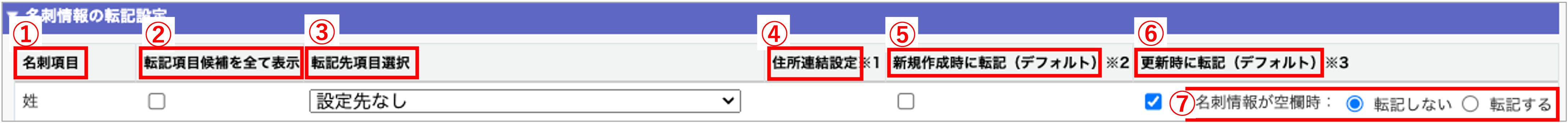 | 名刺項目 | 転記先項目選択 | 住所連結設定 | 新規作成時に転記 | 更新時に転記 | 名刺情報が空欄時 |